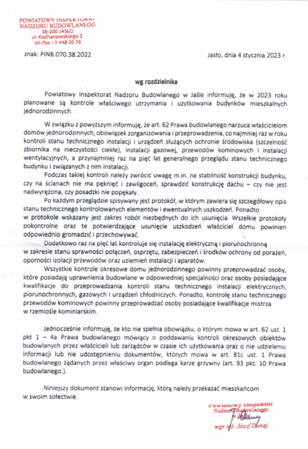 Powiatowy Inspektorat Nadzoru Budowlanego w Jaśle informuje, że w 2023 roku planowane są kontrole właściwego utrzymania i użytkowania budynków mieszkalnych jednorodzinnych.